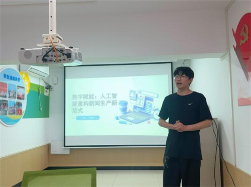 来自校融媒体中心、24040901班的代鑫海同学以“数字赋能:人工智能重构新闻生产新范式”为题进行讲述,通过现场演示,借助"豆包"和"DeepSeek"等AI工具生动展现了智能写作的强大功能。他特别强调:“AI虽然功能强大,但始终无法替代人类的创造力和价值判断。”这一见解引发了在场同学的广泛共鸣和深入思考。