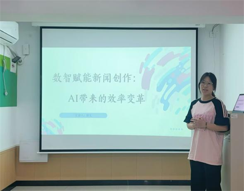 在互动环节,同学们踊跃分享AI写作的实践经验。来自院团总支的周文同学以“数智赋能新闻创作”为题,介绍AI带来的效率革命。她坦言:“最初撰写一篇新闻稿需要绞尽脑汁,耗时约2小时。使用AI写作工具后,不仅效率大幅提升,稿件质量也有明显改善。”她热情鼓励同学们将AI融入日常写作,在学习写作过程中多借鉴、多思考、多打磨,不断提高写作水平。