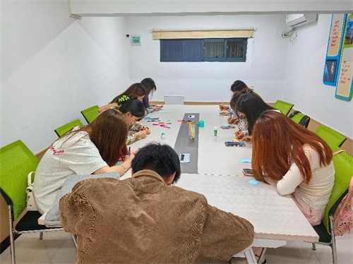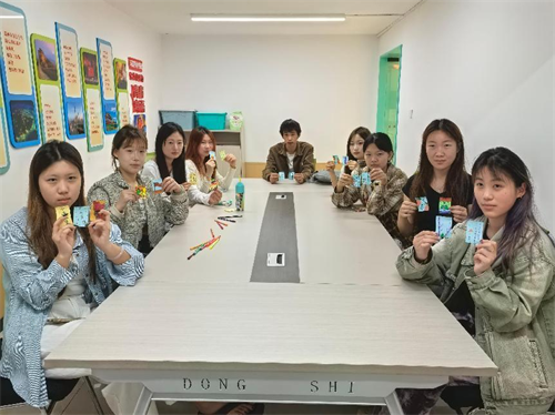 活动伊始,同学们围坐在长桌旁,桌上整齐摆放着彩笔、贴纸、便签纸等丰富的手工材料。大家先通过手机查找灵感,随后便全身心投入创作。现场气氛热烈而欢快,有的同学专注地勾勒出精致的花草图案,有的用心书写励志短句,还有的巧妙搭配贴纸,塑造出一个个独特的形象。在创作过程中,同学们相互交流、分享技巧,彼此的创意在交流中不断碰撞,现场充满了欢声笑语。