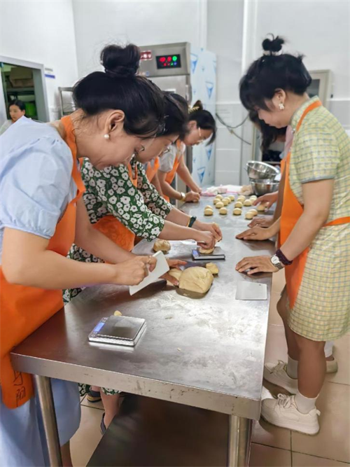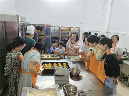 实操环节中,学员们纷纷化身“甜品大师”,大展身手。称量面粉、打发奶油、填充馅料、揉搓面团、……尽管手法略显生疏,但大家热情高涨,现场一派忙碌而有序的景象。值得一提的是,部分老师学员还带着孩子参与其中,亲子共制美食的画面成为课堂上温馨的一幕。孩子们好奇的眼神、欢快的笑声,与烘焙香气交织,让课堂充满了家的温暖。