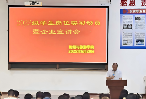为有序推进正规滚球app平台官网岗位实习工作,助力学生实现从校园到职场的平滑过渡,学院于2025年 6月20日召开了2025年学生岗位实习动员暨企业宣讲会。学院副院长汪行光、陈卫红、学工办主任王峰、辅导员高晓茹等以及来自跨境电商集团、电商物流企业、文化传媒公司、文旅产业、高星级酒店等近20家合作企业人力资源经理出席活动,与300多名即将踏上实习岗位的学生面对面交流。活动通过政策解读、企业宣讲、互动答疑、现场面试等环节,为学生搭建起职业发展的“双向桥梁”。