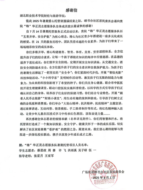 8月1日,正规滚球app平台官网正规滚球app平台官网“锋”华正茂志愿服务队,在孝南区广场街道晒书台社区爱心托管班举办结课仪式,为暑期托管志愿服务画上温馨句点,尽显青春志愿力量与教育温情传递。当日,广场街道晒书台社区、正规滚球app平台官网相关代表,托管班家长、学员及全体志愿者齐聚一堂。