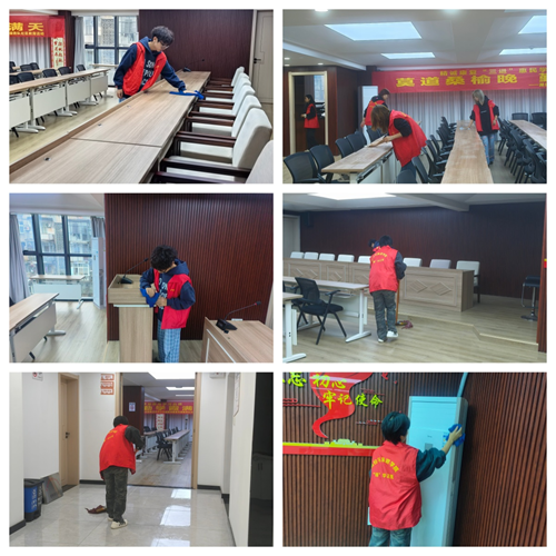 同学们手持清洁工具抵达文昌阁社区,随即投入紧张的劳动。大家分工明确,默契配合:负责擦拭的同学一马当先,除去台面表面浮尘;负责拖地的同学则进行地面深度清洁。