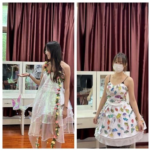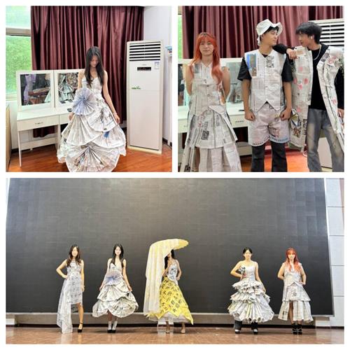 第二组服装则把废旧纸张变成了时尚的代名词。同学们充分发挥自己的想象力和创造力,通过巧妙的剪裁、折叠和拼接,将平凡的纸张变成了一件件造型各异的衣服。有的作品是复古的西装,展现出经典与时尚的完美结合;有的是飘逸的连衣裙,仿佛带着观众穿越回了那个浪漫的时代;还有的是帅气的披风,彰显出独特的个性与魅力。每一件作品都让人眼前一亮,充分展现了同学们丰富的想象力和创新精神。