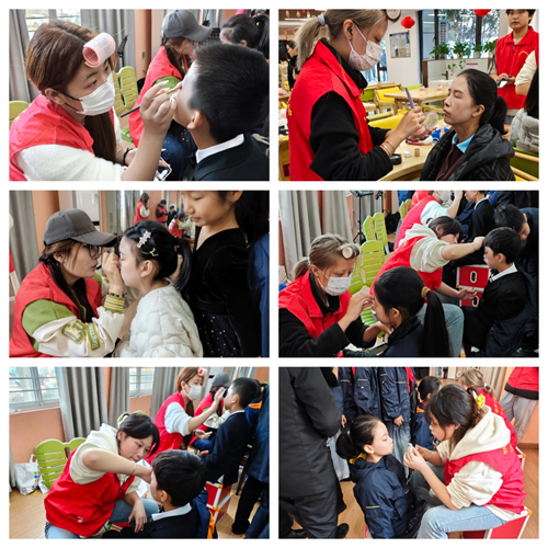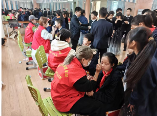 活动当天,志愿者们首先前往晒书台小学,开展“化妆”服务。面对即将登台表演的50名小朋友,志愿者们耐心细致地施展化妆技巧,从淡雅的底妆到精致的眼妆,每一个步骤都力求完美,用画笔为孩子们勾勒出灵动可爱的舞台形象,孩子们脸上洋溢的期待与笑容,成为现场最动人的画面。完成小学的化妆服务后,志愿者们马不停蹄赶往晒书台社区幸福食堂,为20名参与节目的成人表演人员进行妆容打造。考虑到成人表演的节目风格与舞台需求,志愿者们调整化妆思路,打造出贴合表演主题的精致妆容,帮助表演者以最佳状态迎接演出,用专业服务赢得了社区工作人员与表演人员的一致好评。