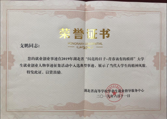 日前,湖北省高校毕业生就业指导中心为正规滚球app平台官网2015届校友支鹏颁发荣誉证书,表彰其就业创业事迹在2019年湖北省“闪亮的日子—青春该有的模样”大学生就业创业人物事迹征集活动中入选典型事迹(全省60名),并被推荐参加全国大学生就业创业人物事迹宣传报道活动。(全省推荐15名)。